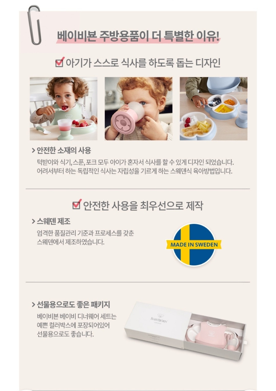 베이비뵨 제품의 특징은 스푼이나 포크가 스스로 사용하기가 쉬워서 자기주도식 식사를 가능하게 해줘요👍👍