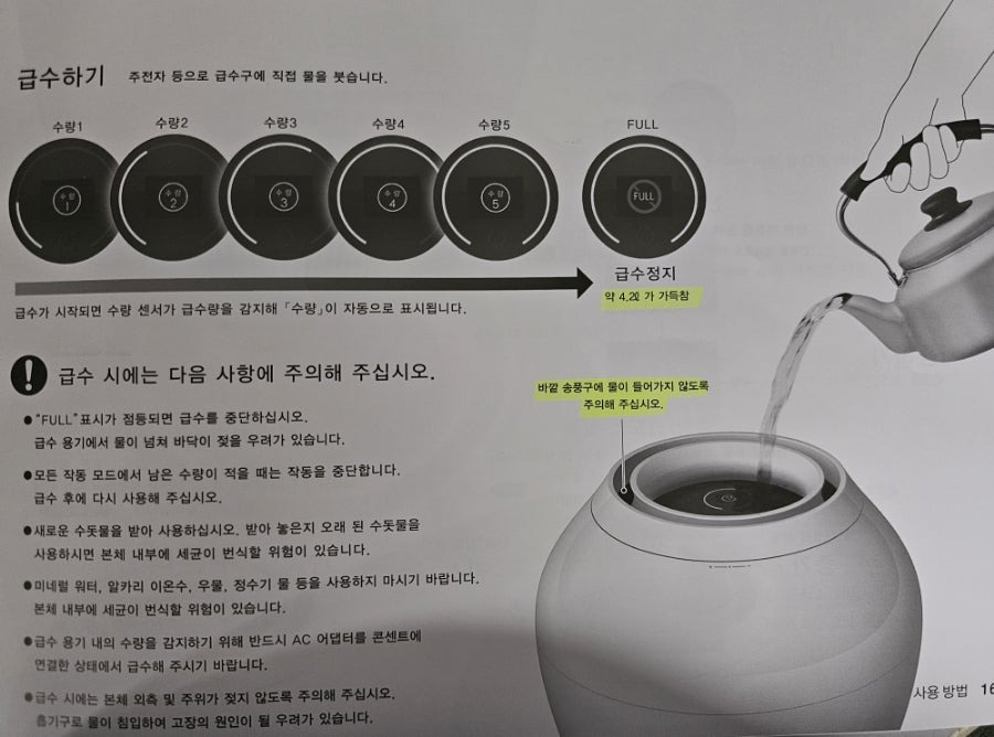full은 4.2리터까지로 풀표시가 뜨기전, 4~5단계까지만 물을 붓는게 좋아요, 풀이 뜨면 물붓는걸 중단하시고요~! 물을 채울 때 링 밖으로 튀지 않게 조심스럽게 붓는게 좋아요! 바깥 송풍구에 물이 들어가지 않게요🙂